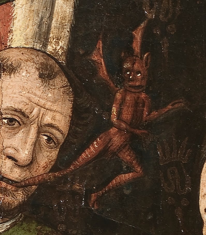 Hélas, la procédure d’obtention des droits pour l’image était trop complexe, et de plus, son détenteur ne la proposait qu’en une définition insuffisante pour l’impression. Notre choix s’est donc reporté sur une tempera sur bois du Musée National d’Art de Catalogne, œuvre d’un anonyme commodément appelé « maître de saint Barthelémy ». Encore partiellement inscrit dans le courant du gothique international de la seconde moitié du XVe siècle, ce panneau provient d’un grand grand retable démembré, dont on ne sait plus rien (le MNAC en conserve deux, le Musée des Beaux-Arts de Bilbao en possède quatre autres). L’arcade rougeâtre qui cerne l’image indique la position des ornements boisés et dorures qui encadraient chacune des scènes.