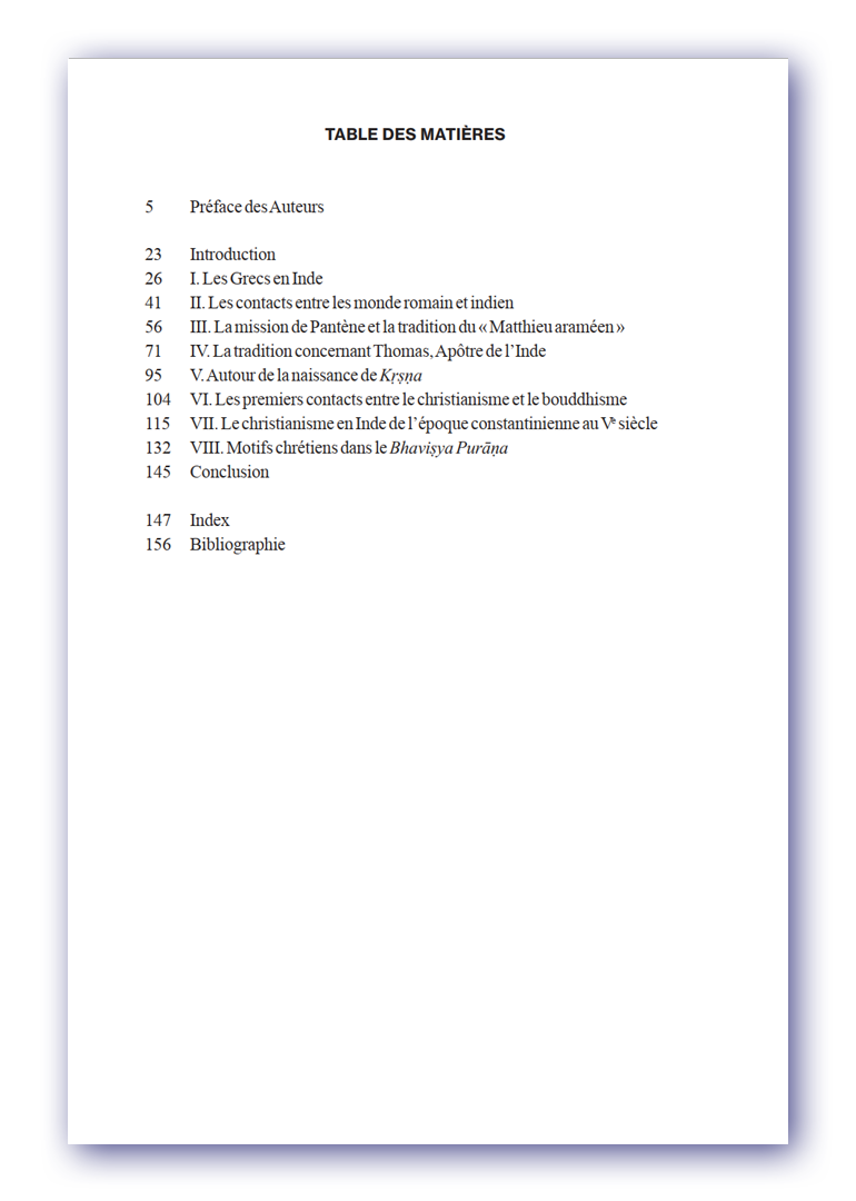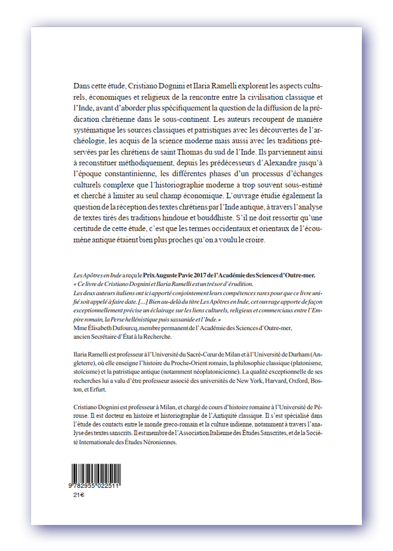 Dans cette étude (172 pages), Cristiano Dognini et Ilaria Ramelli explorent les aspects culturels, économiques et religieux de la rencontre entre la civilisation classique et l’Inde, avant d’aborder plus spécifiquement la question de la diffusion de la prédication chrétienne dans le sous-continent. Les auteurs recoupent de manière systématique les sources classiques et patristiques avec les découvertes de l’archéologie, les acquis de la science moderne mais aussi avec les traditions préservées par les chrétiens de saint Thomas du sud de l’Inde. Ils parviennent ainsi à reconstituer méthodiquement, depuis les prédécesseurs d’Alexandre jusqu’à l’époque constantinienne, les différentes phases d’un processus d’échanges culturels complexe que l’historiographie moderne a trop souvent sous-estimé et cherché à limiter au seul champ économique. L’ouvrage étudie également la question de la réception des textes chrétiens par l’Inde antique, à travers l’analyse de textes tirés des traditions hindoue et bouddhiste. S’il ne doit ressortir qu’une certitude de cette étude, c’est que les termes occidentaux et orientaux de l’écoumène antique étaient bien plus proches qu’on a voulu le croire.
