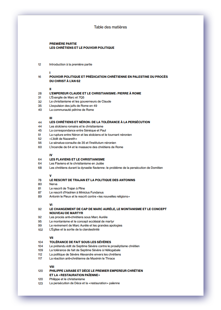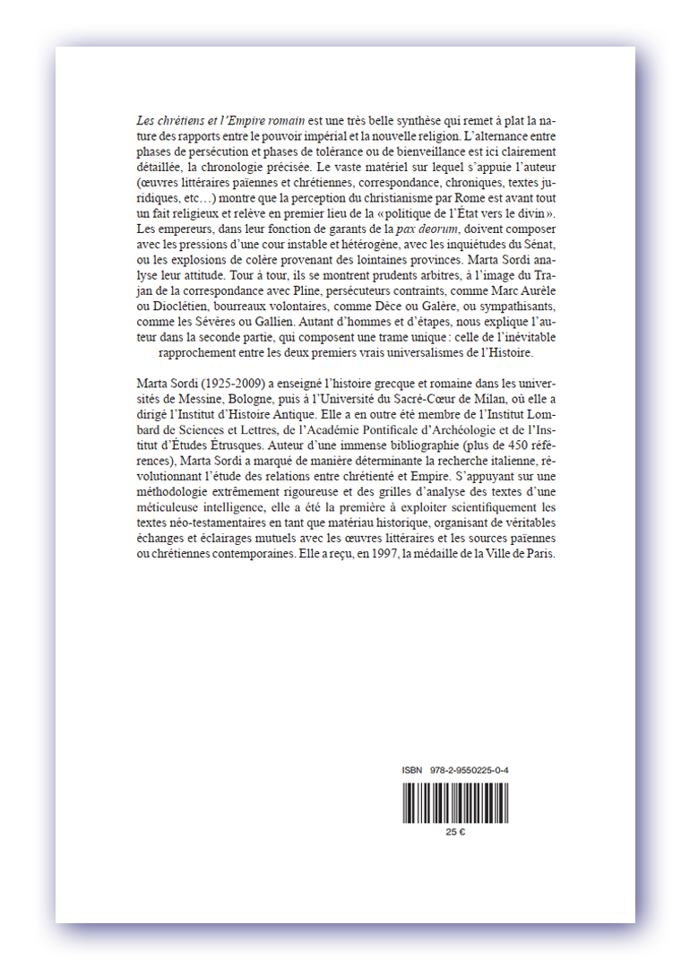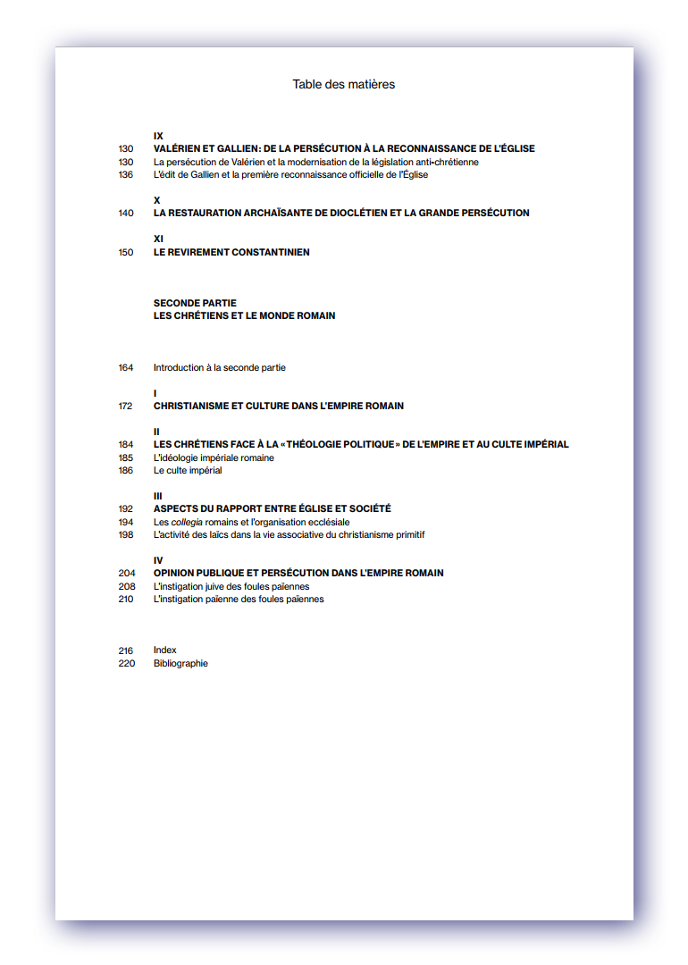 Les chrétiens et l’Empire romain est une très belle synthèse (228 pages) qui remet à plat la nature des rapports entre le pouvoir impérial et la nouvelle religion. L’alternance entre phases de persécution et phases de tolérance ou de bienveillance est ici clairement détaillée, la chronologie précisée. Le vaste matériel sur lequel s’appuie l’auteur (œuvres littéraires païennes et chrétiennes, correspondance, chroniques, textes juridiques, etc…) montre que la perception du christianisme par Rome est avant tout un fait religieux et relève en premier lieu de la « politique de l’État vers le divin ».